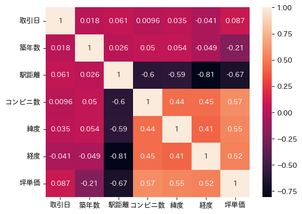# 相関行列 sns.heatmap(df.corr(), annot=True)