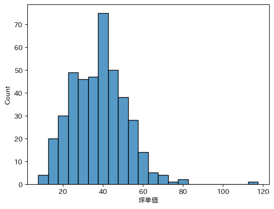 # ヒストグラム sns.histplot(df["坪単価"])