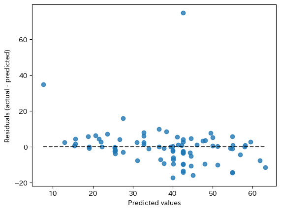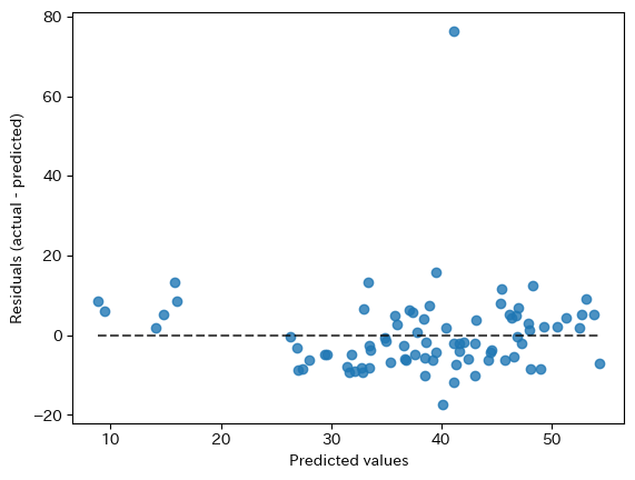 # 実際にあっているかどうかを確認してみる y_eval = pd.DataFrame() y_eval["正解"] = y_test[target] y_eval["予測"] = model_lr.predict(X_test_sc) y_eval["誤差"] = (y_eval["正解"] - y_eval["予測"]) from sklearn.metrics import PredictionErrorDisplay, r2_score, mean_absolute_error, mean_squared_error disp = PredictionErrorDisplay(y_true = y_eval["正解"], y_pred= y_eval["予測"])