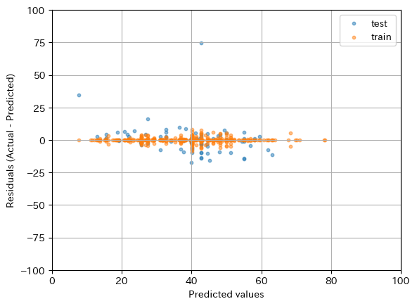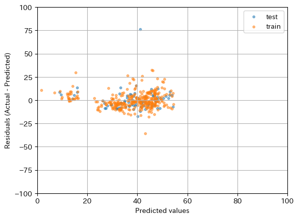 # 残差と予測値を散布図にプロット(訓練データ、テストデータ両方とも)