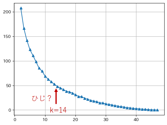 #麺類消費クラスタリングを色んなkでやってみる #誤差を入れるリスト dist = [] #2~47(=都道府県数)の範囲 X=range(2,48) for k in X: #k個のクラスタを作る model = KMeans(n_clusters=k, random_state=0, n_init=10) model.fit(df_sc) #その時の誤差をリストに追加 dist.append(model.inertia_) #折れ線グラフにプロット plt.plot(X, dist, marker='^') plt.grid()