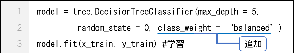 ※ class_weight 引数は不均衡データのときに指定する.決定木モデルだけでなく,他の分類モデルでも同様に指定できる.例,LogisticRegression( class_weight = 'balanced' )