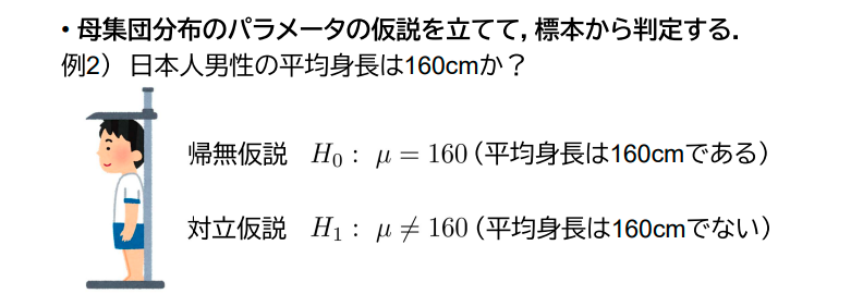 母集団分布のパラメータの仮説を立てて,標本から判定する.†