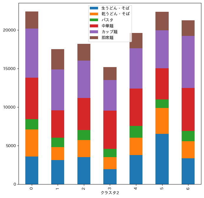 #積み上げ棒グラフで可視化 df_mean.plot.bar(stacked=True, figsize=(8,8))